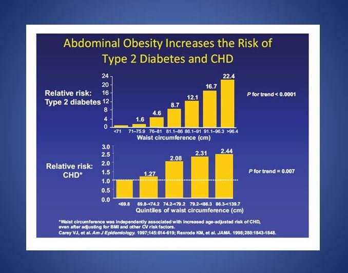 Belly fat (aka abdominal adiposity) is directly related to a person’s risk for both Coronary Heart Disease (CHD) and Type-2 Diabetes.